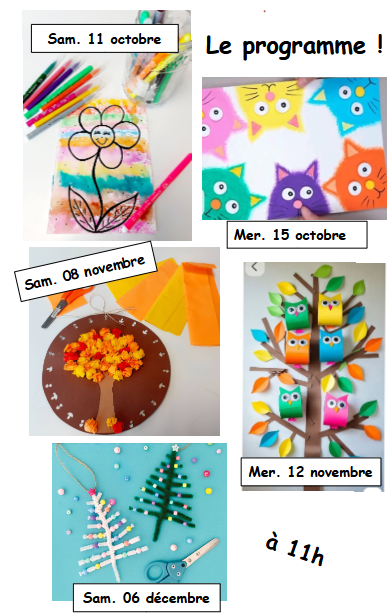 Tous les mois, le mercredi et le samedi matin, la médiathèque propose des ateliers d'activités manuelles pour les enfants à partir de 3 ans.
